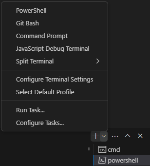 開啟vscode上方標籤的Terminal - New Terminal,若想切換成command prompt(cmd)透過下方terminal右上的+號,選擇command prompt